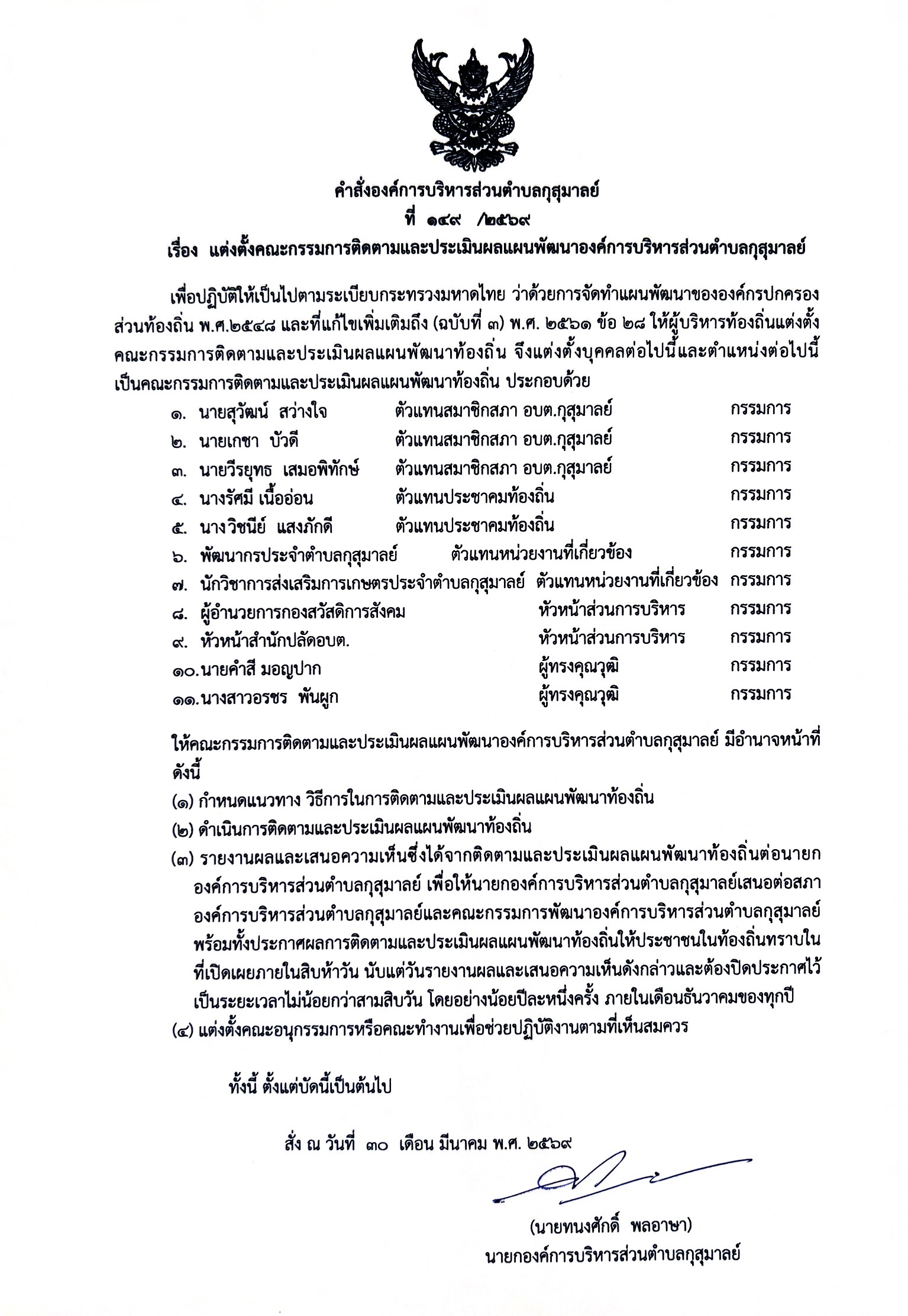 คำสั่งองค์การบริหารส่วนตำบลกุสุมาลย์ ที่ 149 / 2569 เรื่อง แต่งตั้งคณะกรรมการติดตามและประเมินผลแผนพัฒนาองค์การบริหารส่วนตำบลกุสุมาลย์ ลงวันที่ 30 มีนา