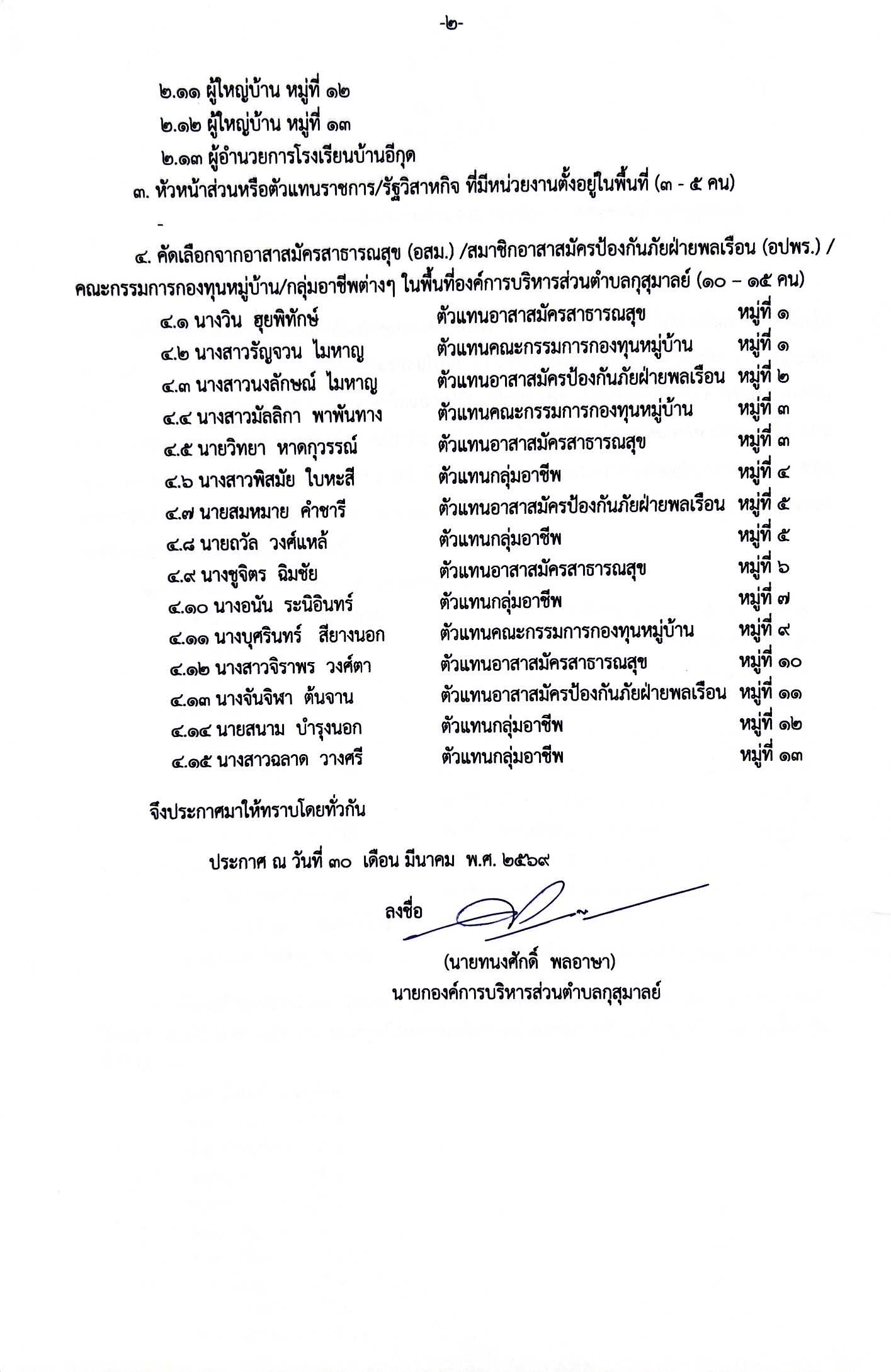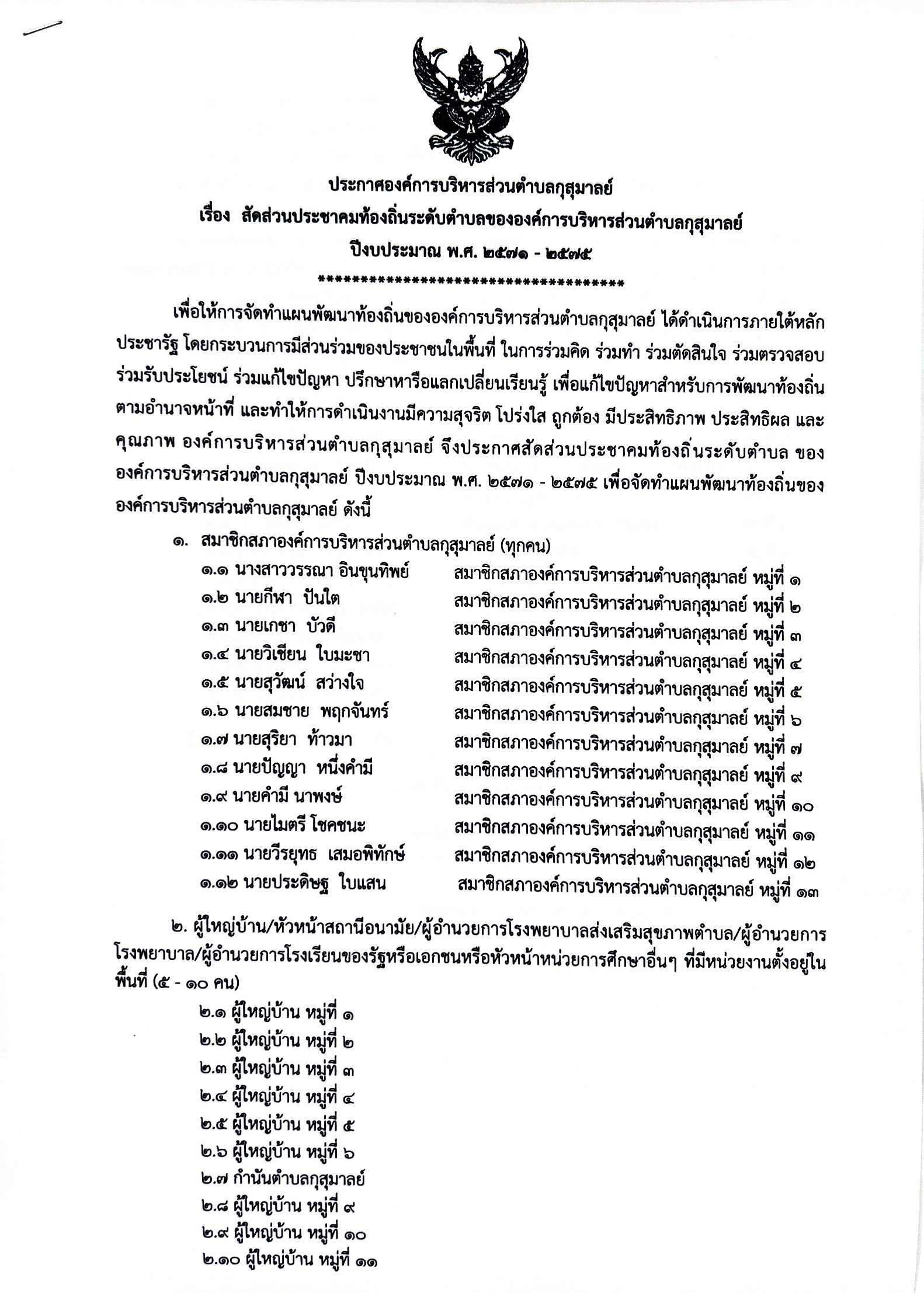 ประกาศองค์การบริหารส่วนตำบล กุสุมาลย์ เรื่อง สัดส่วนประชาคมท้องถิ่นระดับตำบลขององค์การบริหารส่วนตำบลกุสุมาลย์ ปีงบประมาณ พ.ศ. 2571 - 2575