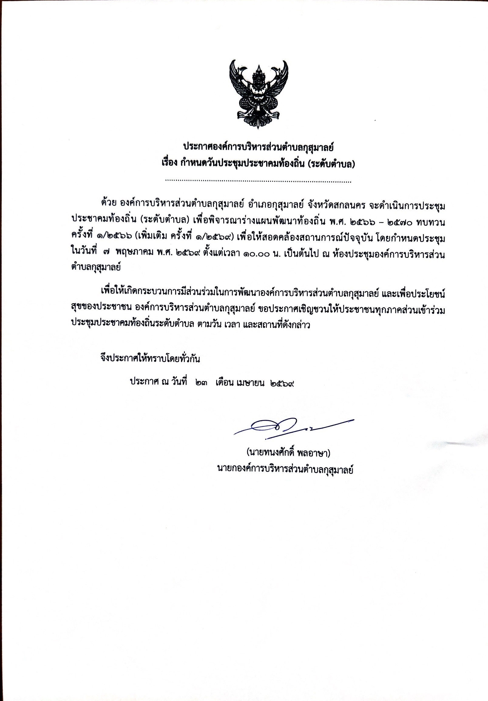 ประกาศองค์การบริหารส่วนตำบลกุสุมาลย์ เรื่อง กำหนดวันประชุมประชาคมท้องถิ่น (ระดับตำบล)